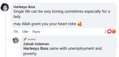 Aliyu commented on the post, writing; “Single life can be boring sometimes especially for a lady. May Allah grant you your heart robe”