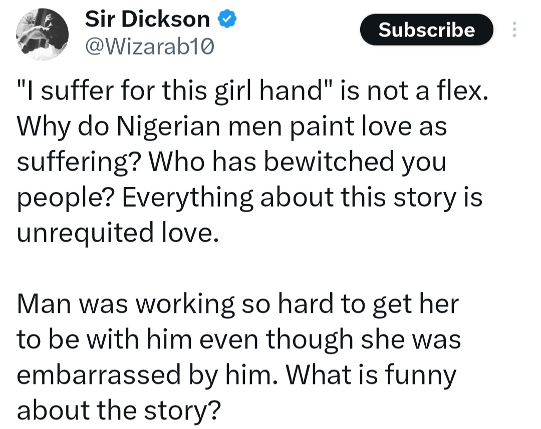 An X user who is single reacted, writing: "'I suffer for this girl hand' is not a flex. Why do Nigerian men paint love as suffering? Who has bewitched you people? Everything about this story is unrequited love.