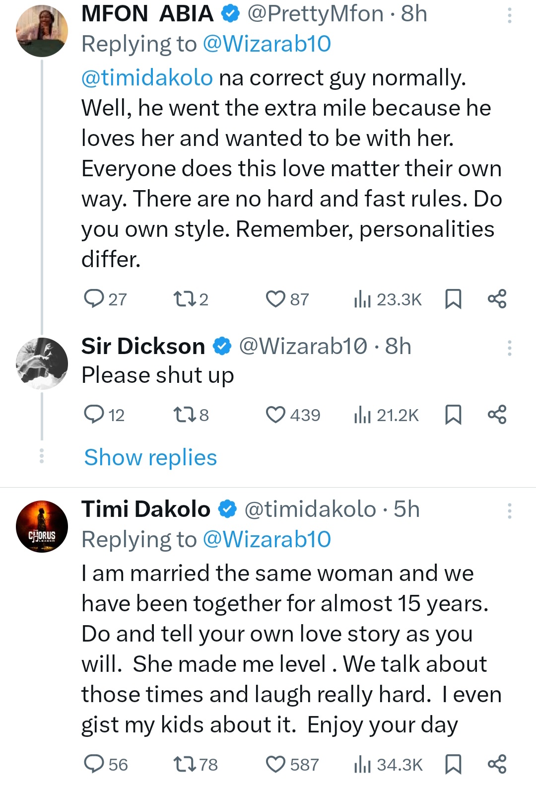 Timi responded: "I am married the same woman and we have been together for almost 15 years.