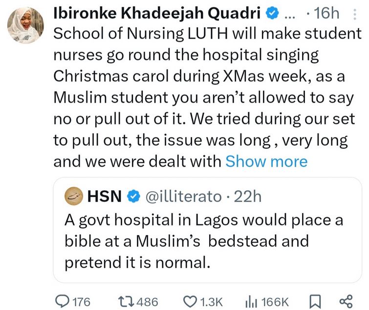 She wrote: "School of Nursing LUTH will make student nurses go round the hospital singing Christmas carol during XMas week, as a Muslim student you aren’t allowed to say no or pull out of it.