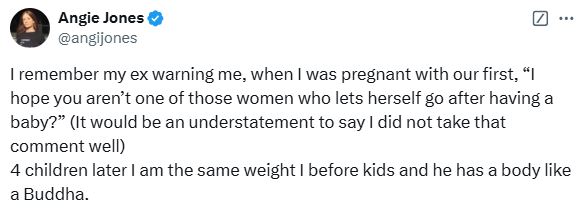 Angie Jones, an Australian woman, has shared a recollection of what her ex-husband allegedly said during her pregnancy with their first child.