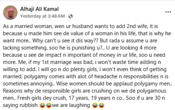 “As a married woman, when your husband wants to add 2nd wife, it is because u made him see de value of a woman in his life, that is why he want more,” he wrote in a Facebook post on Monday.