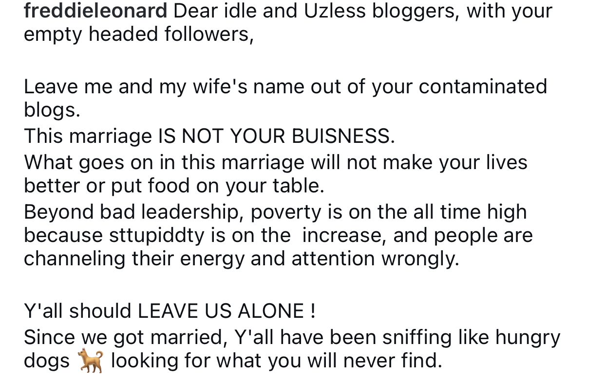 Popular Nigerian actor, Frederick Leonard has criticized bloggers for spreading rumors about a crisis in his marriage to actress Peggy Ovire.
