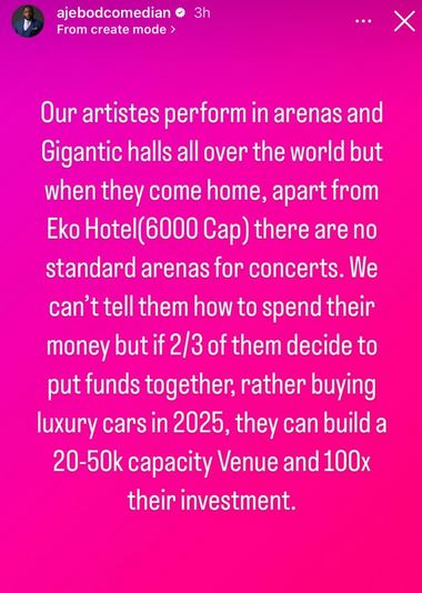 The comedian says rather than splurging huge sums of money purchasing luxury cars in 2025, Nigerian artists should come together and build 20-50k capacity gigantic halls that will give them 100 times their investment.