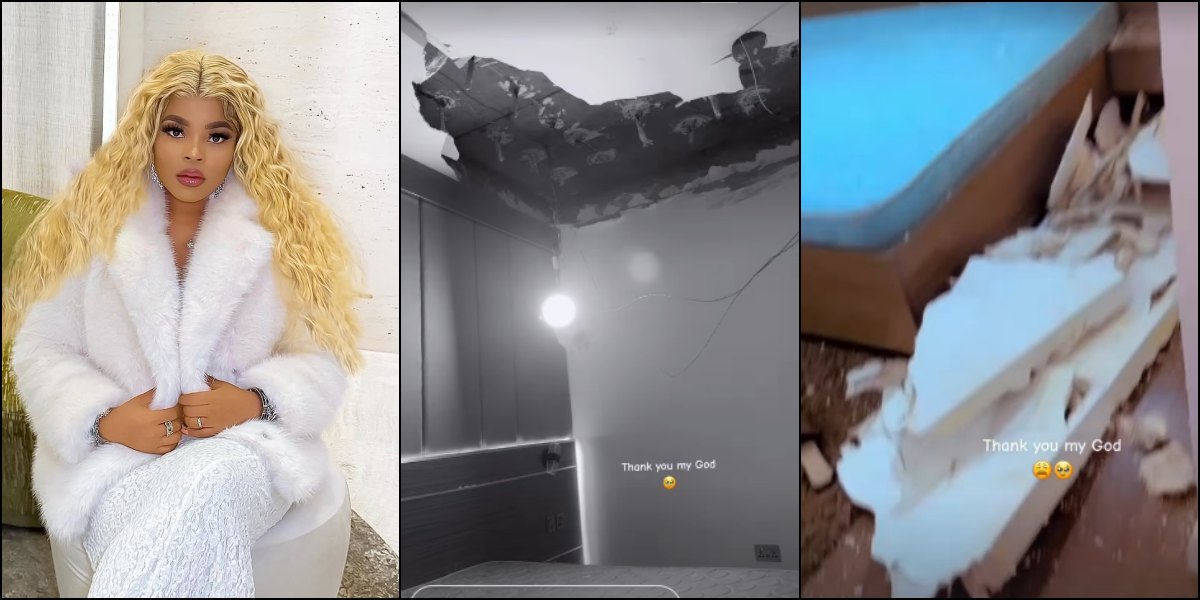 This happened after her POP ceiling fell on her bedside. She took to Instagram to share the sad experience.