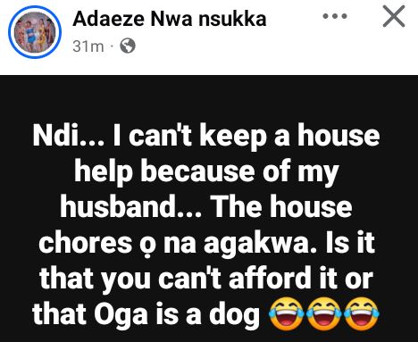 “Ndi I can't keep a house help because of my husband... The house chores ọ na agakwa.