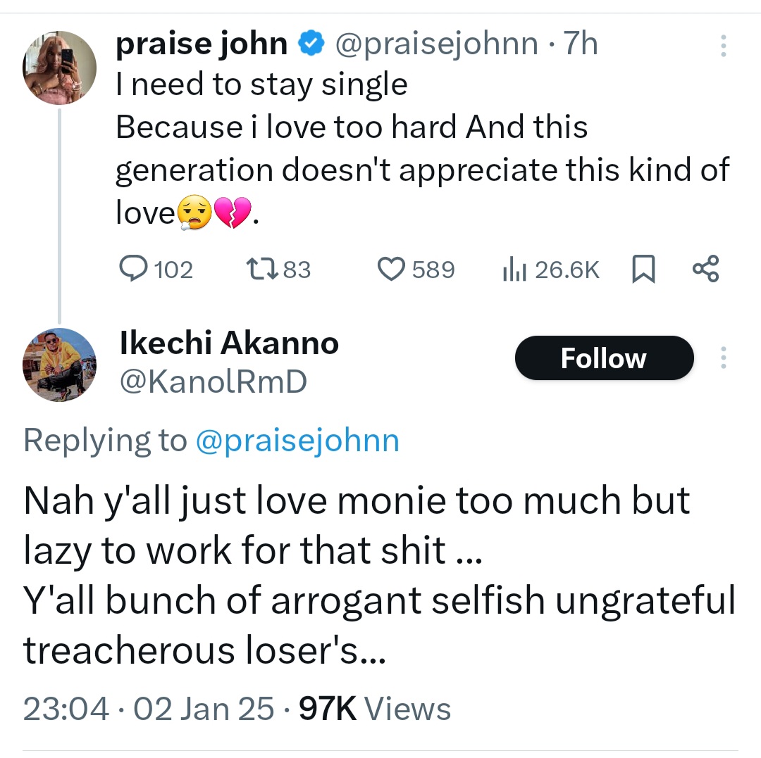 The woman had tweeted that she needs to stay single because she loves too hard and this generation does not appreciate such love.
