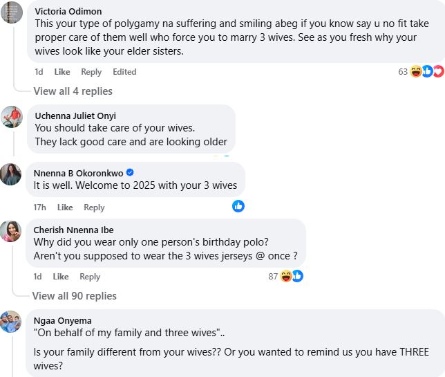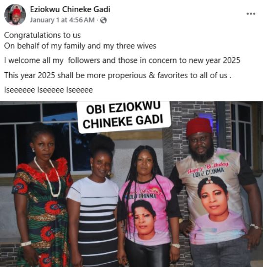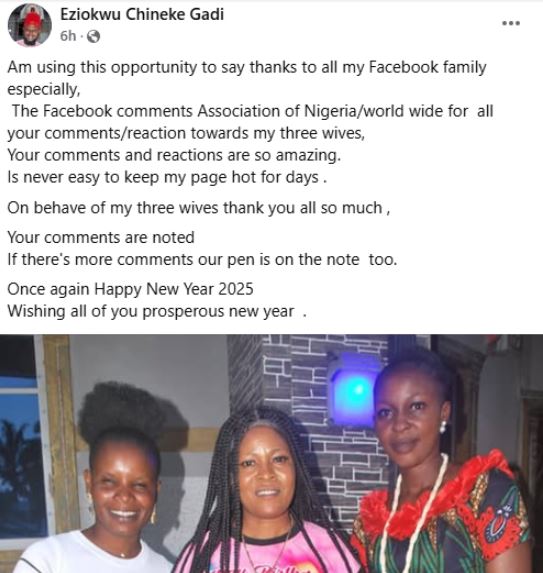 “Am using this opportunity to say thanks to all my Facebook family especially the Facebook comments Association of Nigeria/world wide for all your comments/reaction towards my three wives,” he wrote in a Facebook post on Friday, January 3.