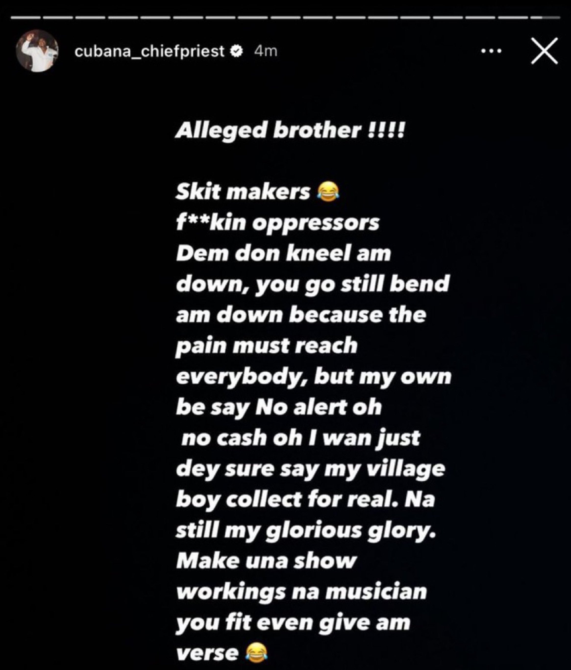 On his Instastory, he wrote, “Alleged brother! Skit makers f**kin oppressors. Dem don kneel am down, you go still bend am down because the pain must reach everybody, but my own be say No alert oh no cash oh I wan just dey sure say my village boy collect for real. Na still my glorious glory.