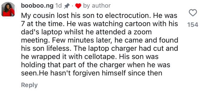 An IG user also shared the sad story of how her brother lost his seven-year-old son through electrocution.