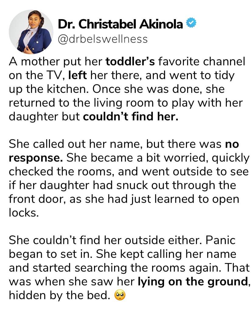 Christabel Akinola, a Nigerian doctor, has recounted the heartbreaking story of how a mother found her toddler de@d after the little girl put a charger connected to power, in her mouth.