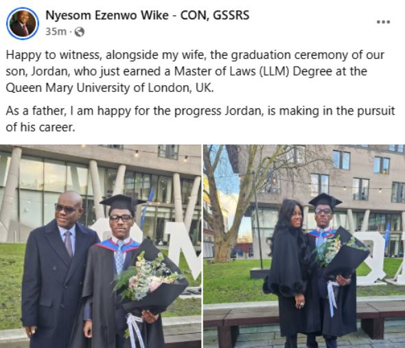 The Minister of the Federal Capital Territory (FCT), Nyesom Wike's son, Jordan, has bagged a master's degree in Law at the Queen Mary University of London, United Kingdom.