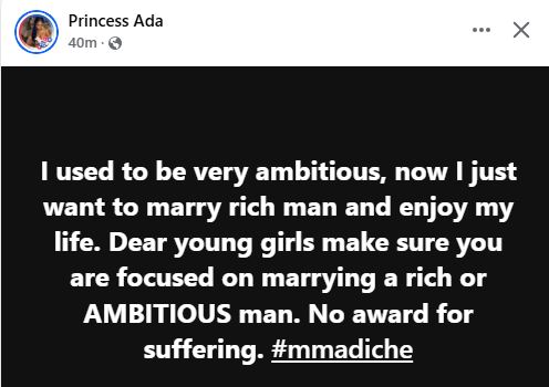 Princess Ada, a US-based Nigerian woman, has handed out some words of advice to young ladies.