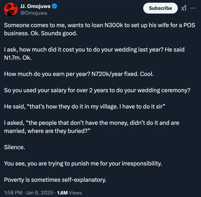 “Someone comes to me, wants to loan ₦300k to set up his wife for a POS business. Ok. Sounds good. I ask, how much did it cost you to do your wedding last year? He said ₦1.7m. Ok. How much do you earn per year? ₦720k/year fixed. Cool. So you used your salary for over 2 years to do your wedding ceremony?”
