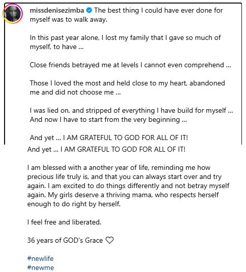 Denise Zimba, a South African actress and singer, has made a startling revelation about her best friend.