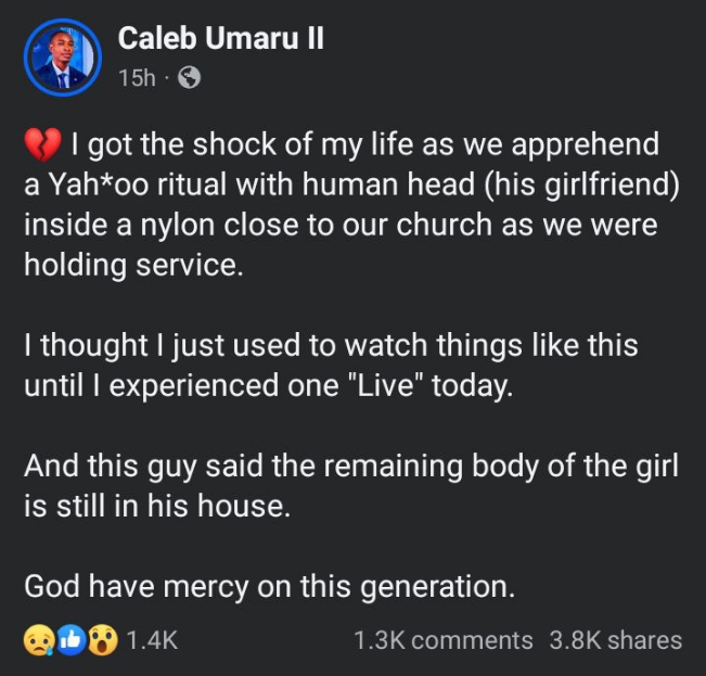 The post read, “I got the shock of my life as we apprehended a Yahoo ritualist with human head (his girlfriend) inside a nylon close to our church as we were holding service.