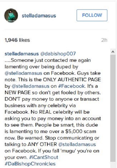 "Someone just contacted me again lamenting over being duped by @stelladamasus on Facebook. Guys take note. This is the ONLY AUTHENTIC PAGE by @stelladamasus on #Facebook. It's a NEW PAGE so don't get fooled by others. DON'T pay money to anyone or transact business with any celebrity via Facebook. No REAL celebrity will be asking you to pay money into an account to see them. People be smart, this dude is lamenting to me over a $5,000 scam now. Be warned. Stop communicating or talking to ANY OTHER @stelladamasus on Facebook. If you fall 'mugu' you're on your own. #iCantShout #DaBishopChronicles''