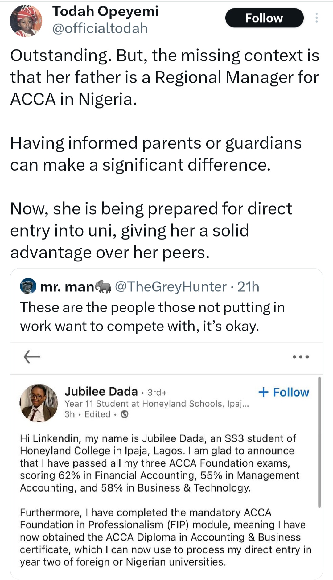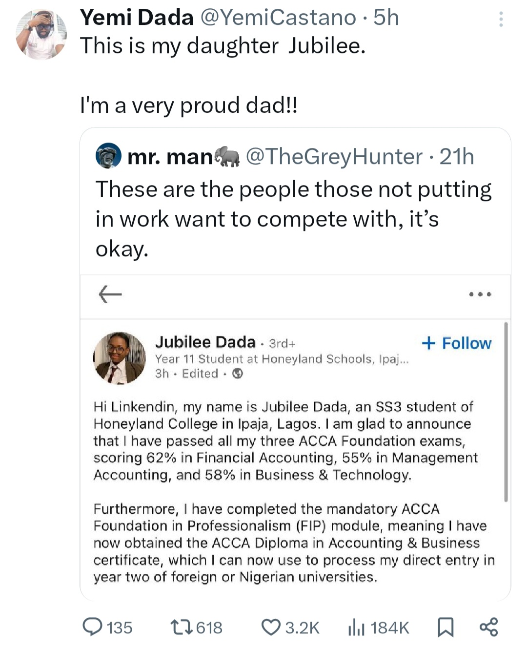 The LinkedIn profile of Jubilee Dada, a secondary school student, is trending on X.