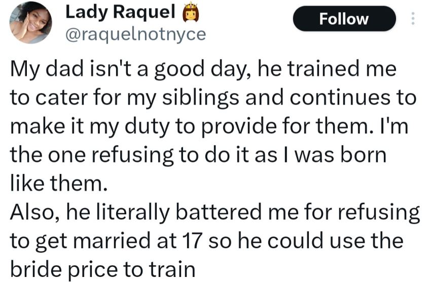 She wrote: "My dad isn't a good day, he trained me to cater for my siblings and continues to make it my duty to provide for them. I'm the one refusing to do it as I was born like them.