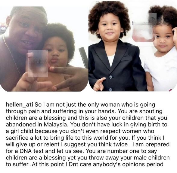 In her caption, she wrote: '' So I am not just the only woman who is going through pain and suffering in your hands. You are shouting children are blessings and this is also your children that you abandoned in Malaysia.