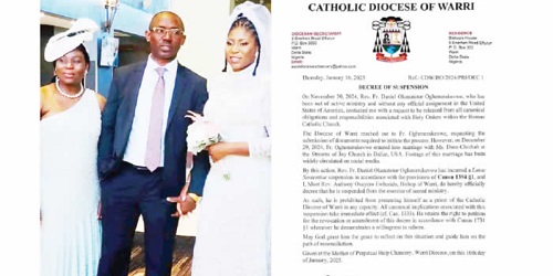 The priest tied the matrimonial knot with his wife, Dora Chichah, at the Stream of Joy Church in Dallas, USA, on December 29, 2024, without waiting to be released from his canonical obligations and responsibility by the universal Church.