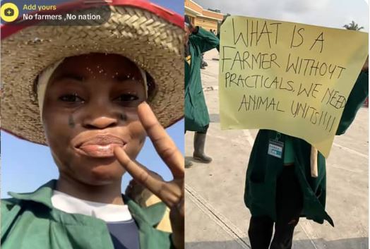 A viral Tiktok video captured the students holding placard that read, “No animal unit in the agriculture department,” while another stated, “We didn’t come to a five-year course to learn only ewedu and efo.”