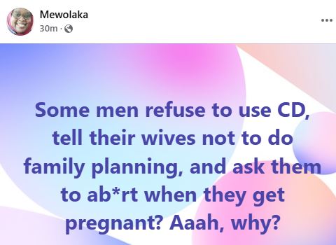“Some men refuse to use CD, tell their wives not to do family planning, and ask them to ab*rt when they get pregnant? Aaah, why?” she wrote in a Facebook post on Wednesday.