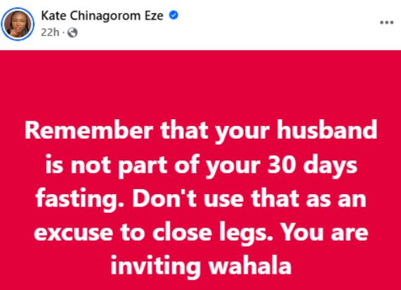 A Nigerian lady, Kate Chinagorom Eze has a word for women engaging in fasting and neglecting their marital obligations.