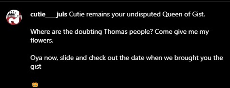 “Cutie remains your undisputed Queen of Gist. Where are the doubting Thomas people? Come give me my flowers. Oya now, slide and check out the date when we brought you the gist.”