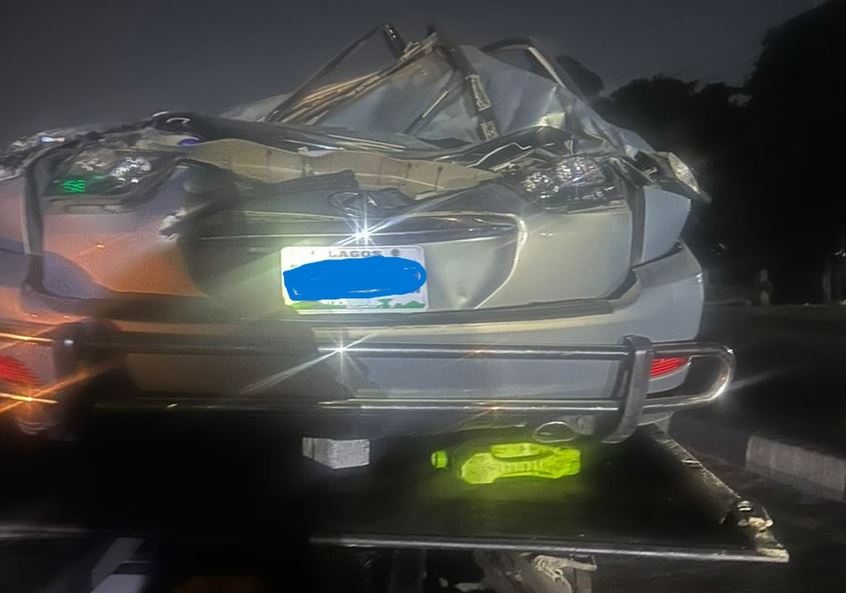 A miracle on Lagos roads! On Wednesday night, tragedy was averted after a 40-foot container fell off a moving truck and landed on a Lexus 330 SUV in Lagos. Incredibly, the two occupants of the SUV survived the harrowing accident.