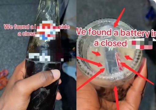 According to the lady, she had bought the drink to enjoy, only for her to find the battery in the sealed bottle.