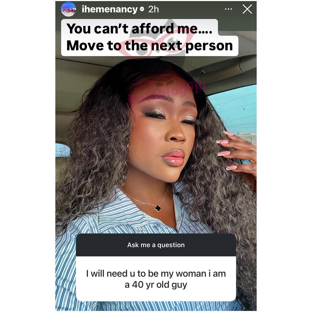 It all started during an Instagram Q&A session when a follower expressed his interest, writing, “I will need u to be my woman I am a 40 yr old guy.”