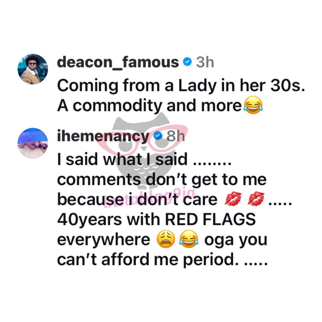 She further clarified that her refusal stemmed from red flags she observed, adding, “I said what I said… comments don’t get to me because I don’t care. 40 years with RED FLAGS everywhere. Oga, you can’t afford me, period.”