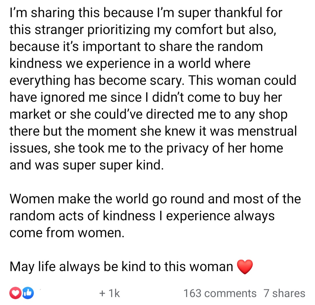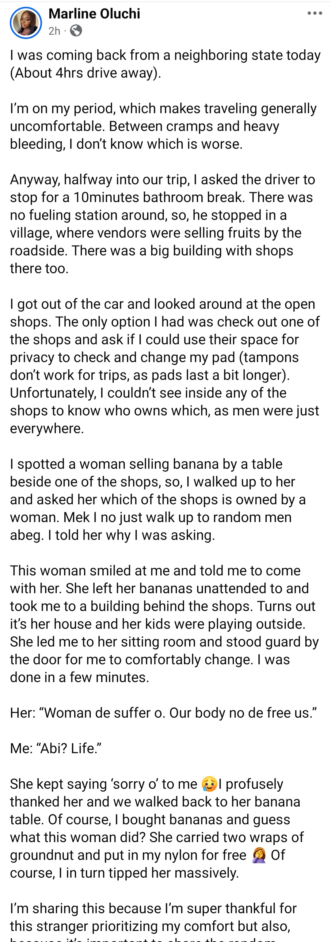 A woman has recounted how a random banana seller came to her aid during a challenging moment while traveling during her time of the month.