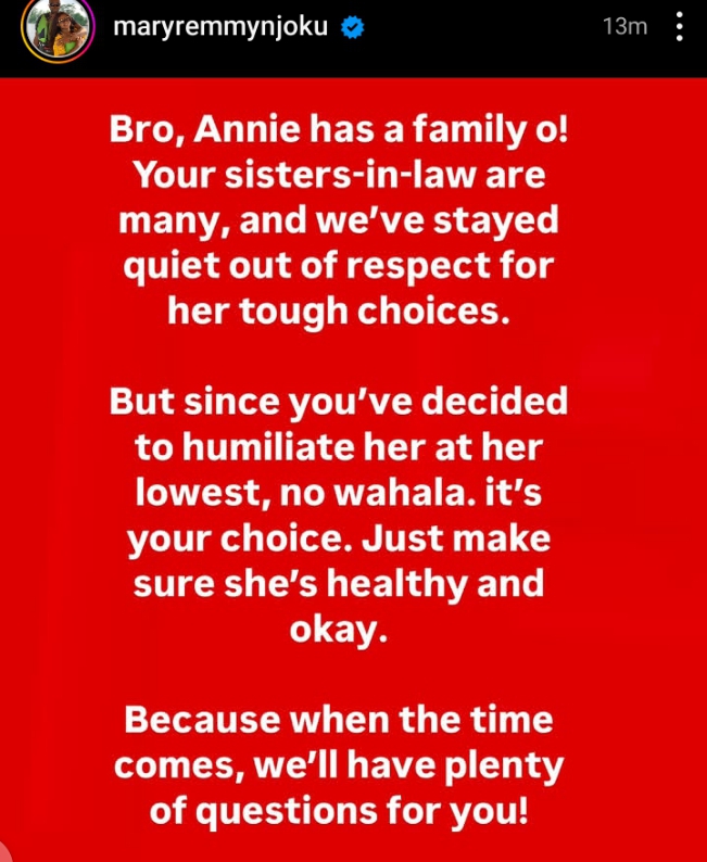 “Bro, Annie has a family of, your sisters-in-law are many, and we’ve stayed quiet out of respect for her tough choices.