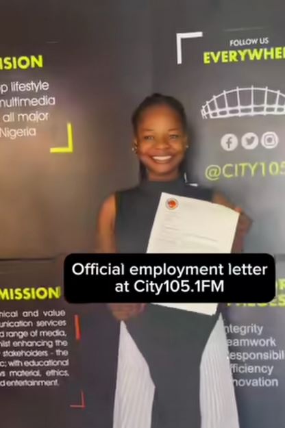 Olajumoke shared the thrilling news with her fans on social media, posting a video that showcased her employment letter.