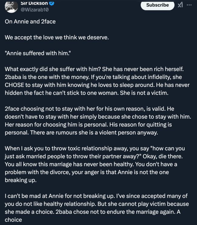 “We accept the love we think we deserve. Annie suffered with him. What exactly did she suffer with him? She has never been rich herself. 2Baba is the one with the money. If you’re talking about infidelity, she CHOSE to stay with him knowing he loves to sleep around. He has never hidden the fact he can’t stick to one woman. She is not a victim.”