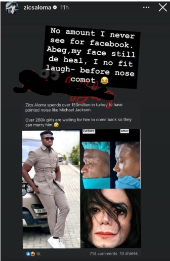 Popular skit maker, Zic Saloma has reacted to a post revealing the cost of his nose surgery in Turkey.