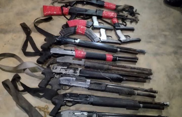 The items recovered include two AK- 47 Riffles, 8 Pump Action guns,4 Locally made Pistols, 3 packets of Cartridges(101 Cartridges) 4 empty Magazines of AK-47 Riffles, 3 Cutlasses, one Baofeng Radio, one motorcycle and many charms