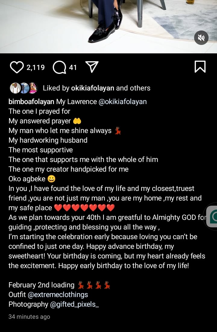 Nollywood actress and producer Bimbo Afolayan has celebrated her man, Okiki Afolayan ahead of his 40th birthday.