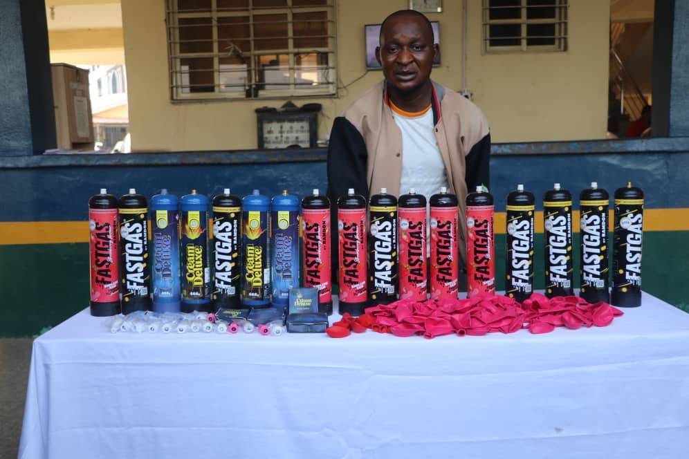 The FCT Police Command has arrested 27-year-old dispatch rider Magaji Adamu for allegedly transporting multiple cartons of nitrous oxide, commonly known as "laughing gas," suspected to be intended for illegal use.
