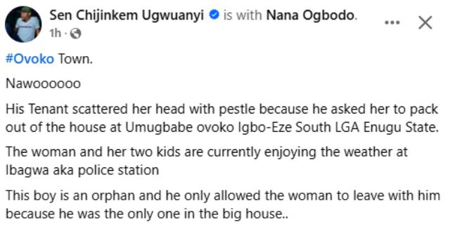 Enugu media personality, Chijinkem Ugwuanyi, who disclosed this in a Facebook post on Friday, January 31, 2025, said the woman attacked the orphaned young man after he asked her to pack out.