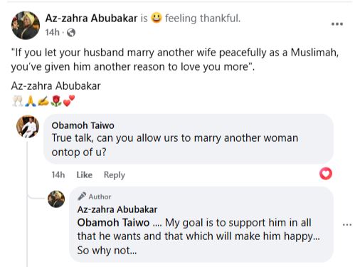 “If you let your husband marry another wife peacefully as a Muslimah, you’ve given him another reason to love you more,” she wrote in a Facebook post on Saturday.