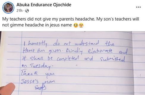 A Nigerian woman, Abuka Endurance Ojochide has sent a message to her son's teacher regarding his assignment.