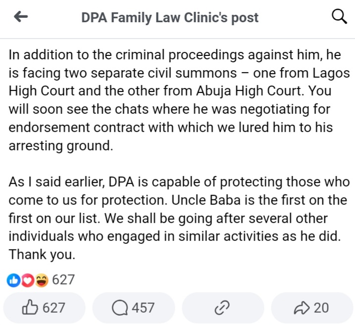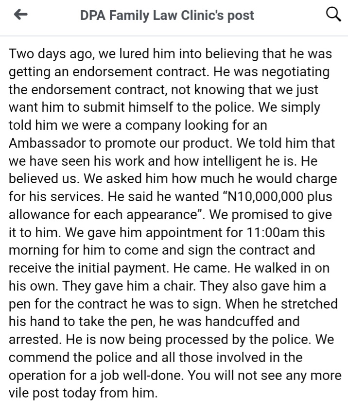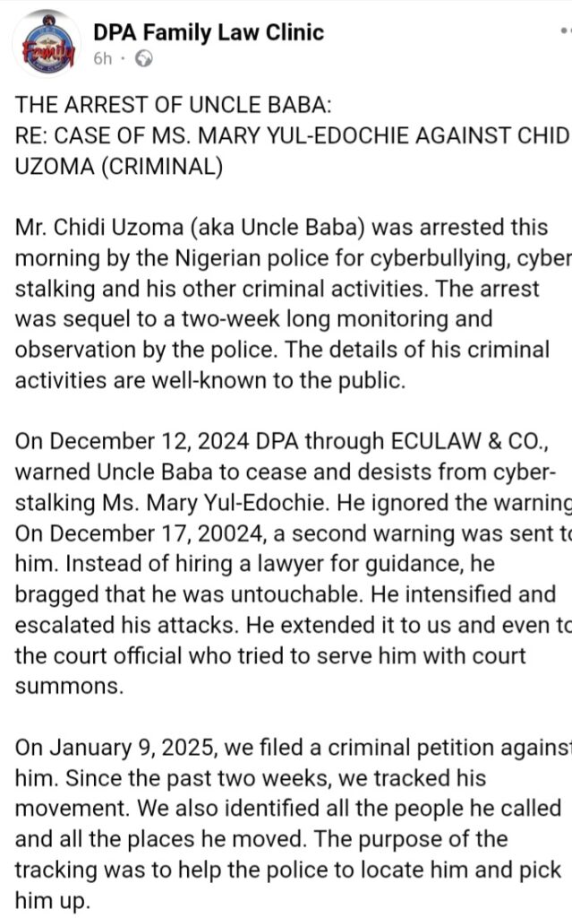 A content creator, Uzoma, popularly known as Baba De Baba has been arrested by the police.
