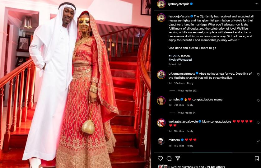 She wrote, “The Ojo family has received and accepted all necessary rights and has given full permission privately for their daughter’s hand in marriage. What you’ll witness now is the fulfilment of all duties and the celebration of love! We’ll be serving a full-course meal, complete with dessert and extras – because we do things our own special way! Sit back, relax, and enjoy this beautiful and memorable journey with us!”