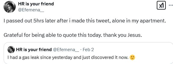 A Nigerian lady, Efemena, has recounted how she escaped death by a whisker after a gas leak in her apartment.