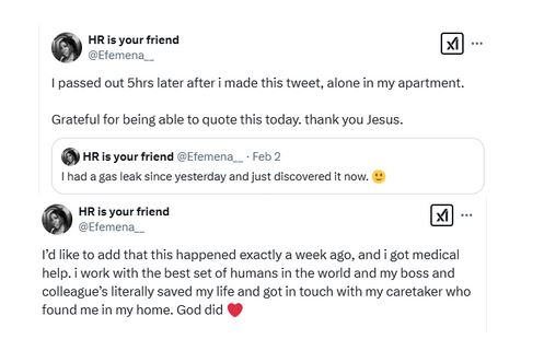 “I’d like to add that this happened exactly a week ago, and I got medical help. I work with the best set of humans in the world and my boss and colleagues literally saved my life and got in touch with my caretaker who found me in my home. God did.”