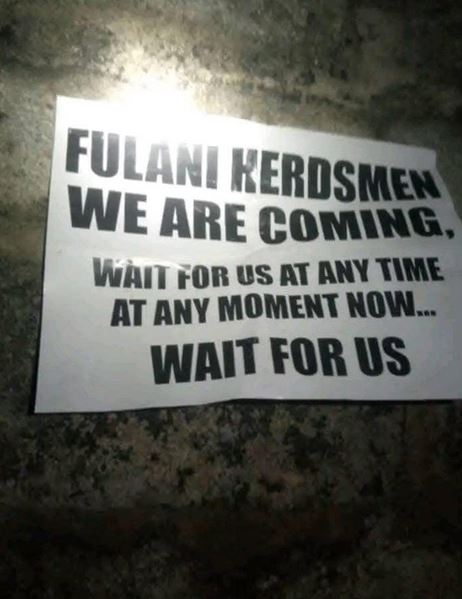 Residents of Umuoba had on Monday night, February 10, night discovered the threat notice on their gates, which read, “FULANI HERDSMEN. WE ARE COMING. WAIT FOR US AT ANYTIME, ANY MOMENT NOW. WAIT FOR US."