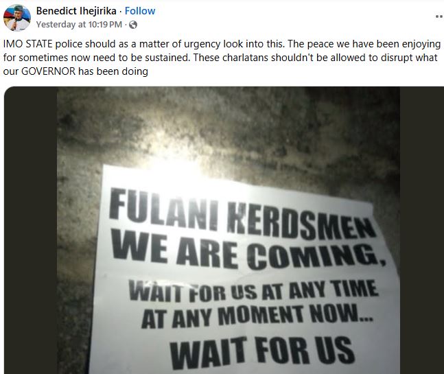 The threatening words, “FULANI HERDMEN WE ARE COMING WAIT FOR US AT ANYTIME ANY MOMENT NOW WAIT FOR US,” has significantly contributed to the heightened level of anxiety among local residents of Irete and Owerri metropolis.